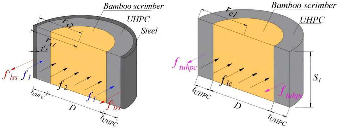 内置圆形重组竹的方形钢管UHPC组合柱(CBUFST)是钢管、UHPC和竹材的高效组合结构形式,期望同时获得组合结构的理想的轻质性、延性及承载力。在外层钢管的约束作用下,内置重组竹能够帮助缓解UHPC在达到极限承载力后的强度快速下降问题,重组竹赋予CBUFST兼具材料来源低碳可再生、自重轻及极限荷载之后稳定的承载力等。