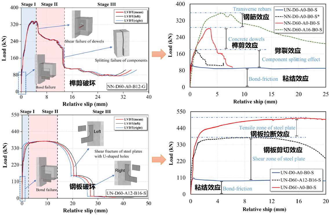 研究共完成了20个推出试件试验,全面考察了横向钢筋直径(d)、钢板开孔形式(圆形/U形孔)、装配方式等关键变化参数下,试件的荷载-滑移响应、破坏模式及受力机理。研究结果表明,试件因装配方式的不同呈现出3种主要的破坏模式:中间混凝土部件破坏(CF-M)、两侧混凝土部件破坏(CF-S)、开孔钢板连接件破坏(SPF)。对于混凝土部件破坏的试件,配置横向钢筋可显著提升试件的延性,配置12mm、16mm直径钢筋的试件,其极限滑移能力较无横向钢筋试件分别提高了115.4%和257.7%;对于开孔钢板破坏的试件,圆孔型开孔钢板由于有更大的受剪撕裂面,其抗剪性能优于U形孔开孔钢板,承载力提高了34.5%,延性提升了97.2%。在试验的基础上本研究对剪力的传递机理进行了定量分解,建立了统一的抗剪承载力计算模型,并收集了150个试验数据对模型进行了严格验证,结果显示试验值与模型预测值比值的均值(Avg)为1.07、变异系数(CoV)为0.19,在所有破坏模式下均具备稳定的计算精度。