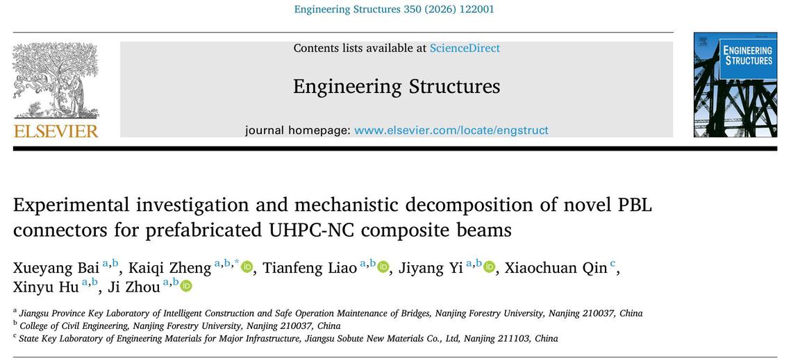 近日,少妇 桥梁团队研究生在土木工程领域国际著名期刊《Engineering Structures》(中科院一区Top,IF=6.4)上发表了题为“Experimental investigation and mechanistic decomposition of novel PBL connectors for prefabricated UHPC-NC composite beams”的研究论文。该成果以少妇 为第一完成单位,硕士生白学洋为第一作者,郑开启副教授为通讯作者,成果受到了国家自然科学基金资助。