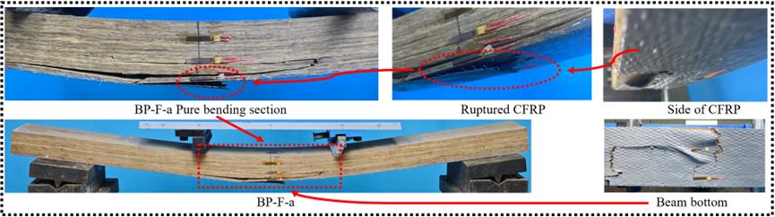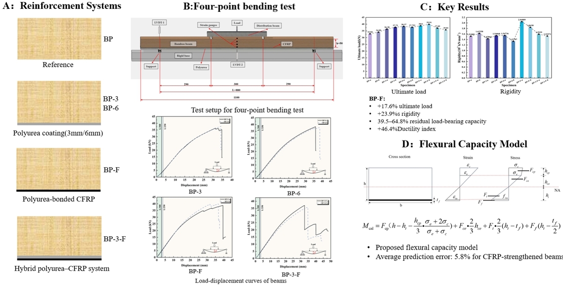研究结果表明,聚脲作为一种功能性的“增韧过渡区”,能够有效协调脆性竹基体与高模量CFRP之间的变形差异。在所有加固组中,以聚脲粘结CFRP的加固配置(BP-F)表现最为优异,其极限承载力提升了17.6% ,同时延性指数大幅提高了46.4%。尤为值得一提的是,得益于聚脲优异的包裹和约束作用,该复合加固系统在试件破坏后仍能保留39.5%至64.8%的残余承载力,改善了传统竹结构突发性的脆性破坏模式。此外,在试验基础上,本研究结合竹材的弹塑性受压特征建立了抗弯承载力理论预测模型,该模型对CFRP加固梁的预测误差仅为5.8%,具备极高的预测精度。