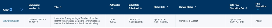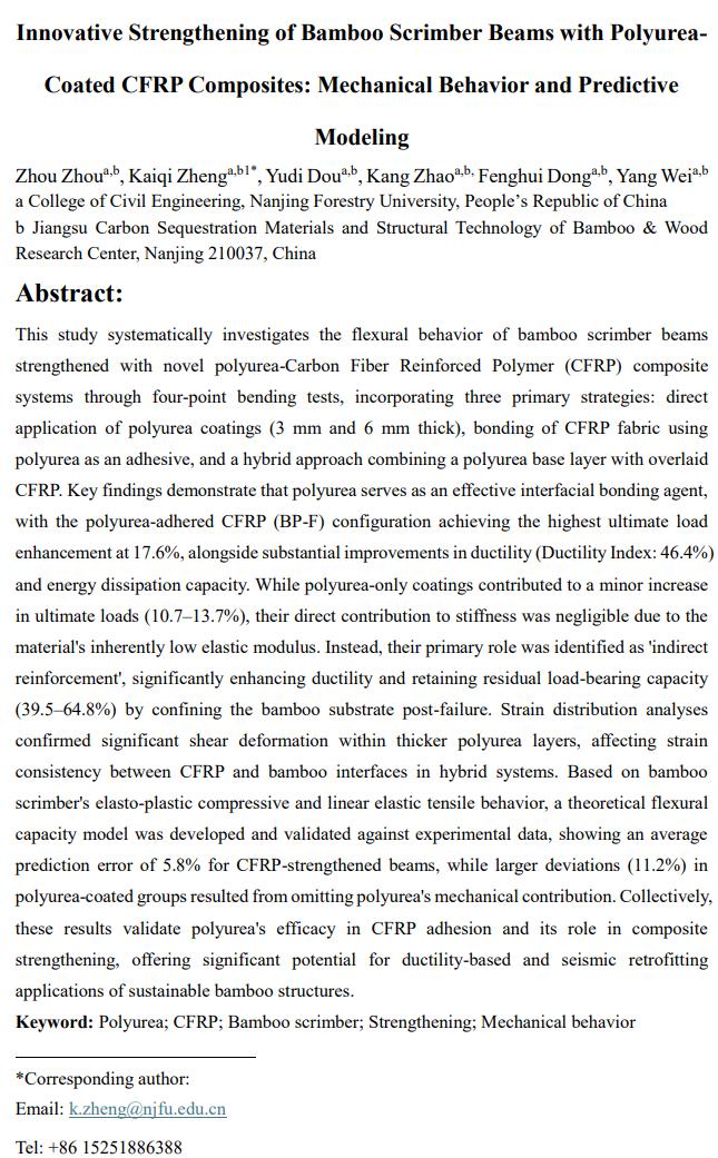近日,少妇 交通土建工程系本科生撰写的题为“Innovative Strengthening of Bamboo Scrimber Beams with Polyurea-Coated CFRP Composites: Mechanical Behavior and Predictive Modeling”的研究论文,被土木工程领域国际著名期刊《Construction and Building Materials》(中科院1区,IF=8.0)正式录用。该成果以少妇 为第一完成单位,本科生周舟为第一作者,郑开启副教授为通讯作者,成果受到了国家自然科学基金的资助。
